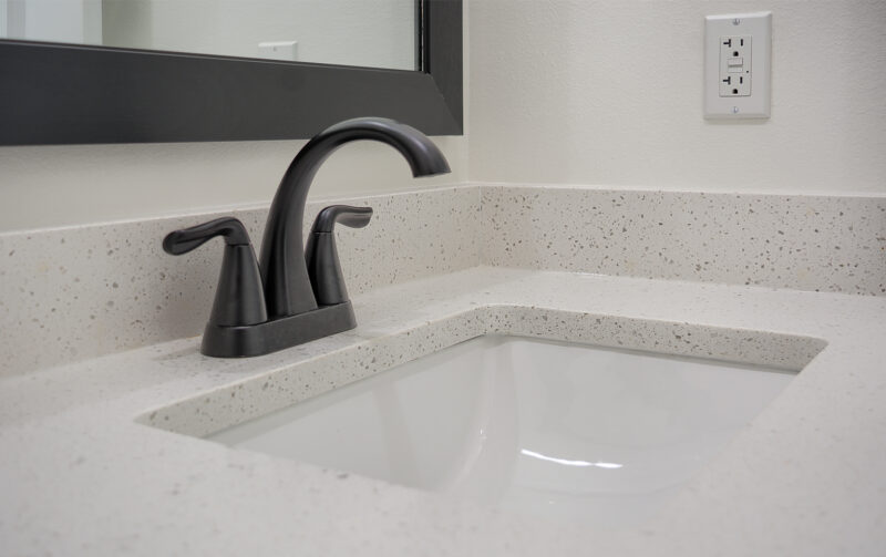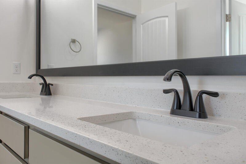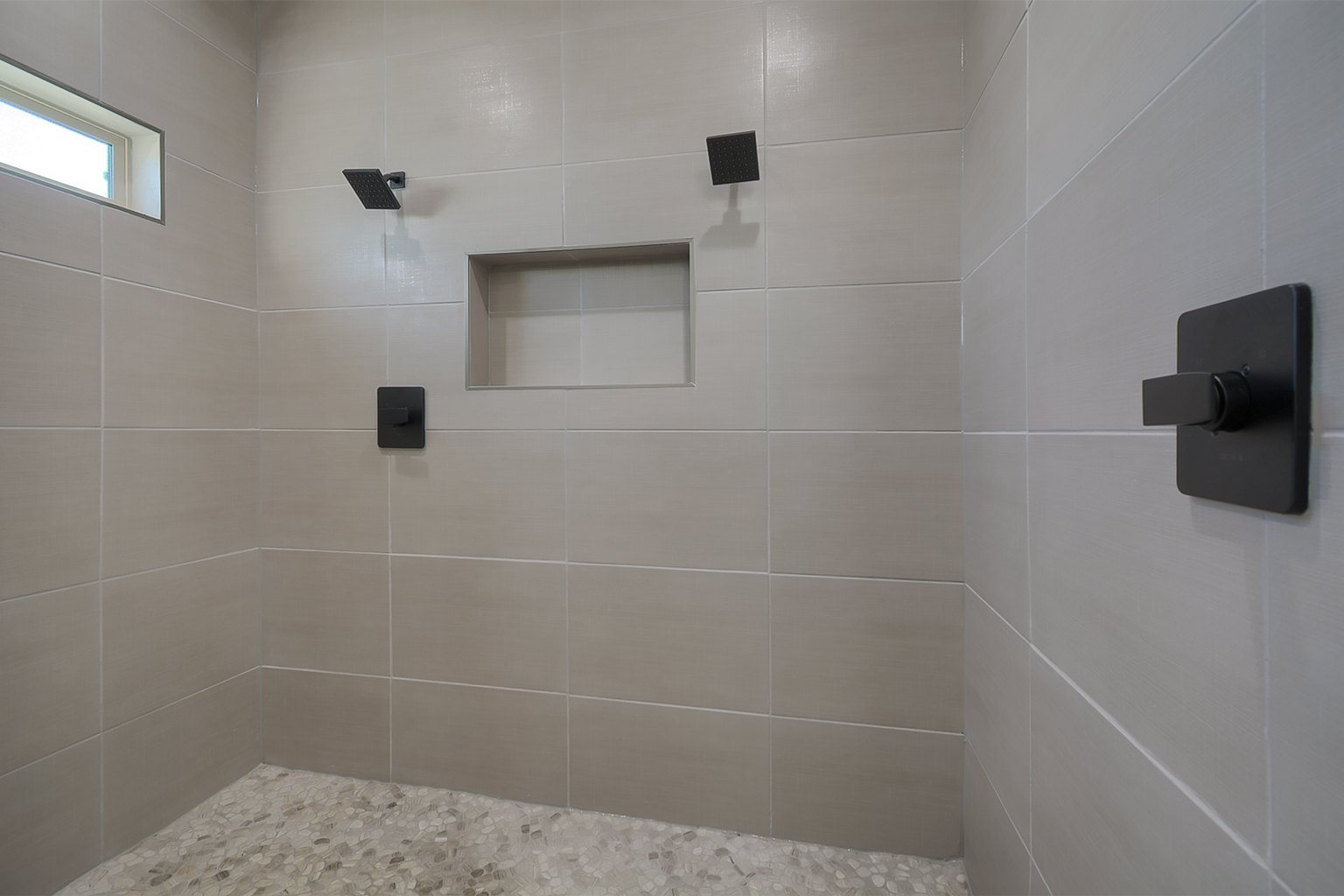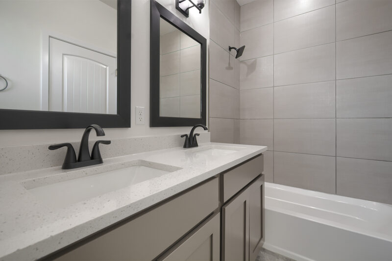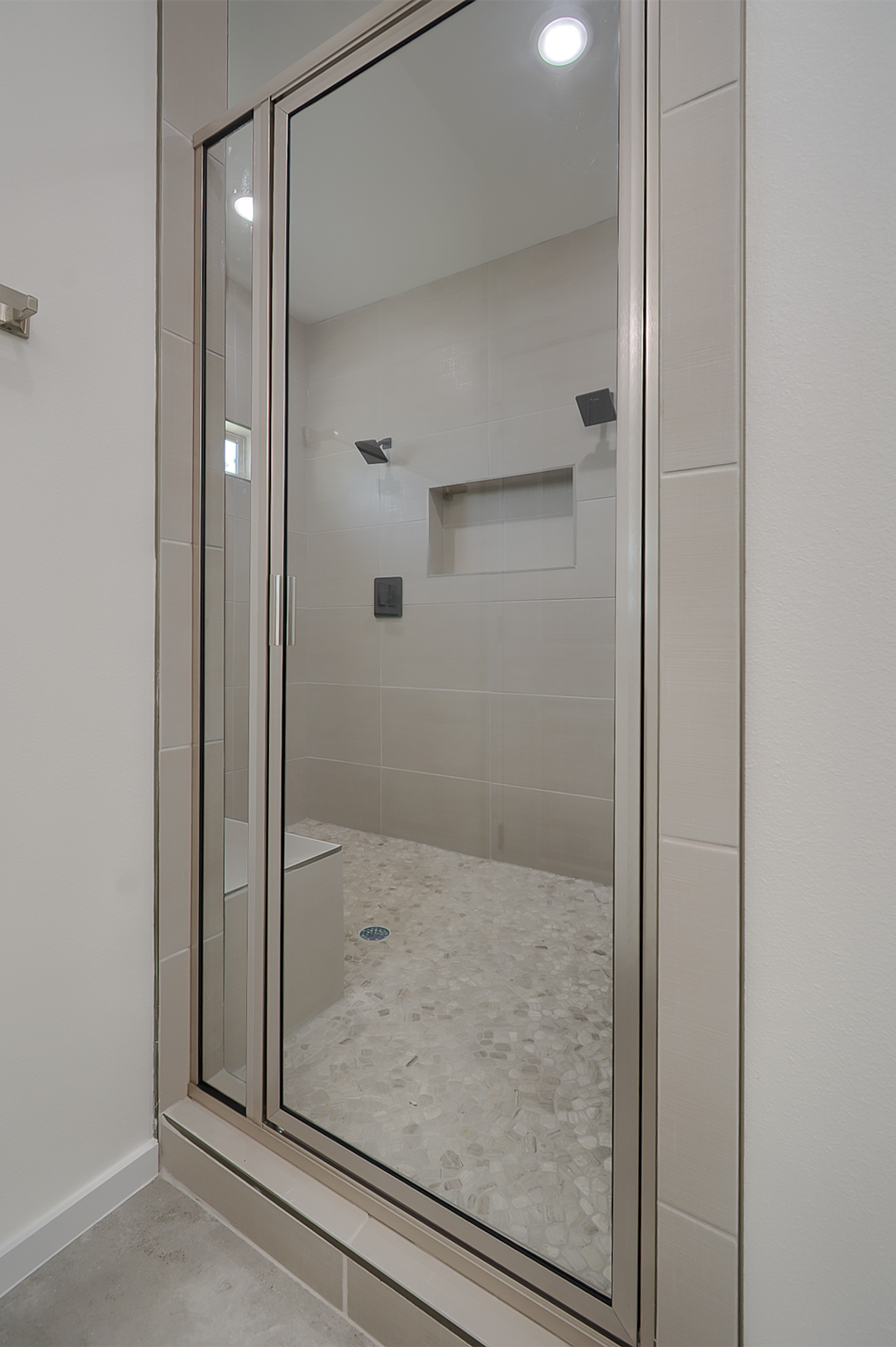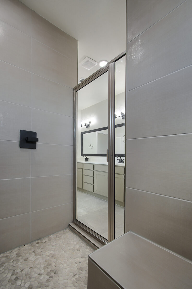 bathroom. Here, dual vanities, a standing shower with integrated seating, and dual showerheads