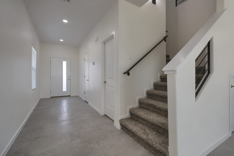 right. The staircase is thoughtfully tucked away just before the family room, maintaining an open