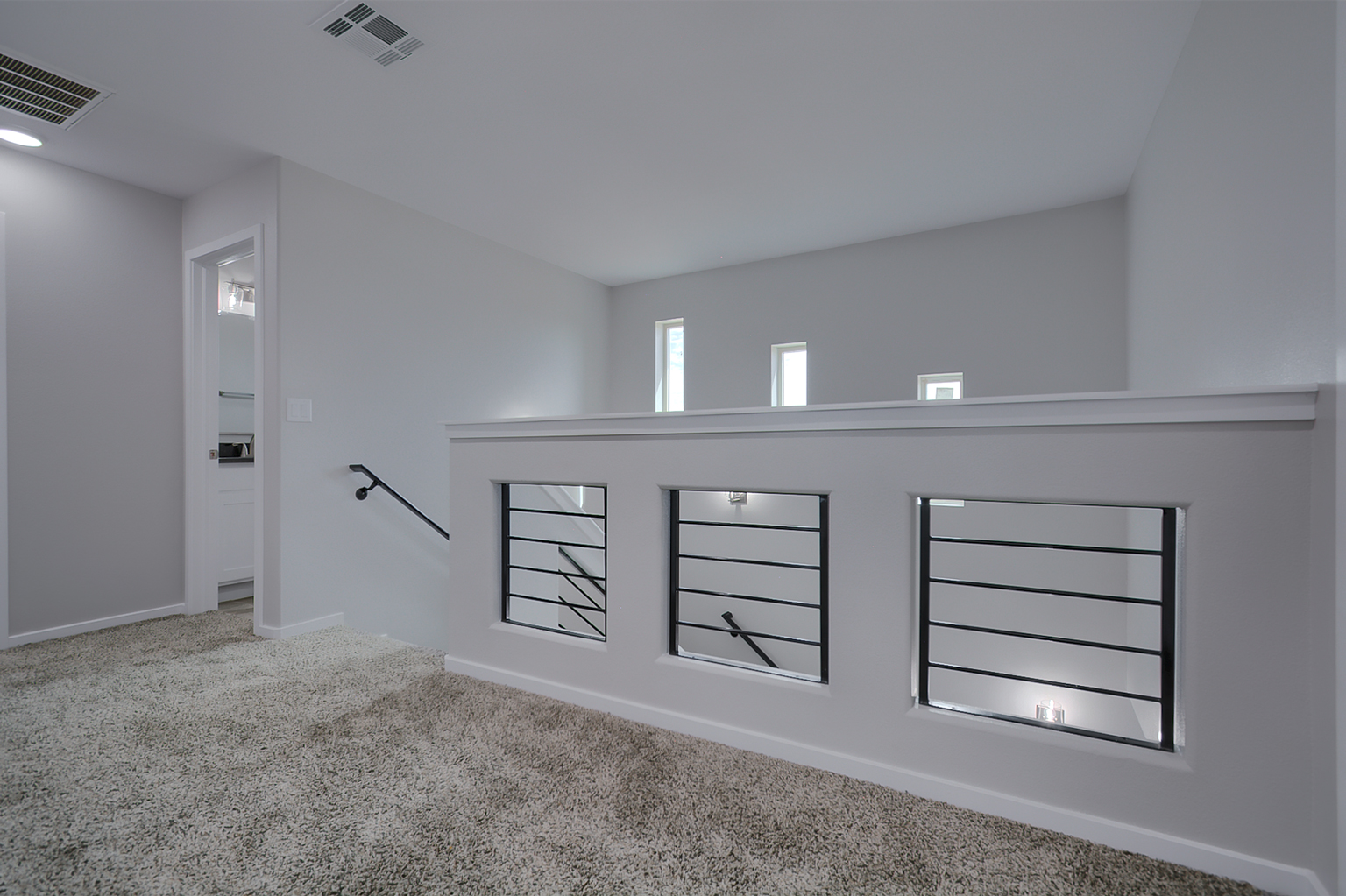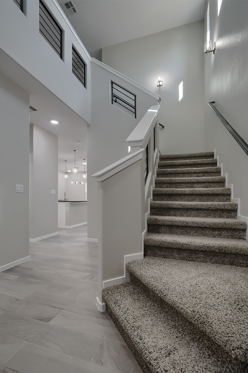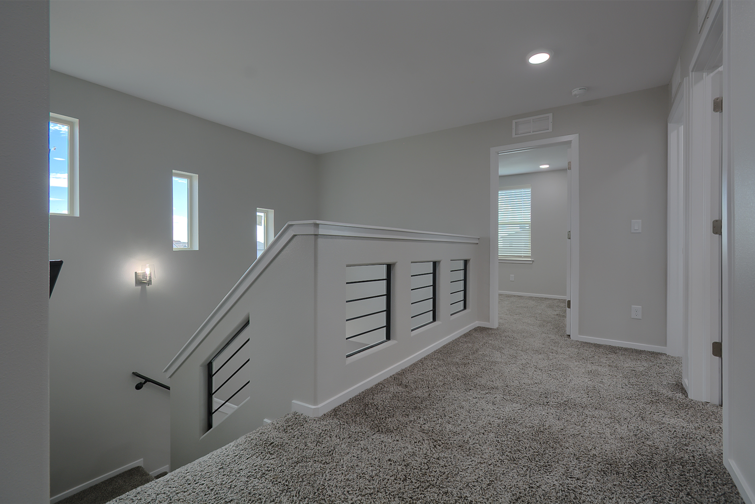 Upstairs, a light‑filled landing leads to the home’s private quarters. The primary suite features a