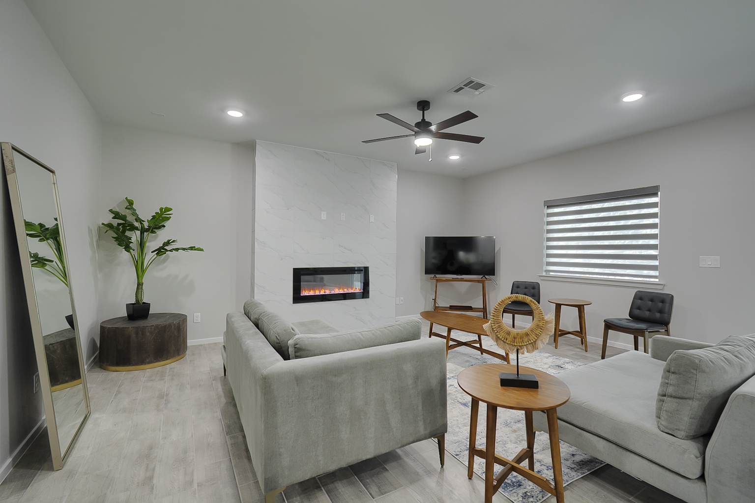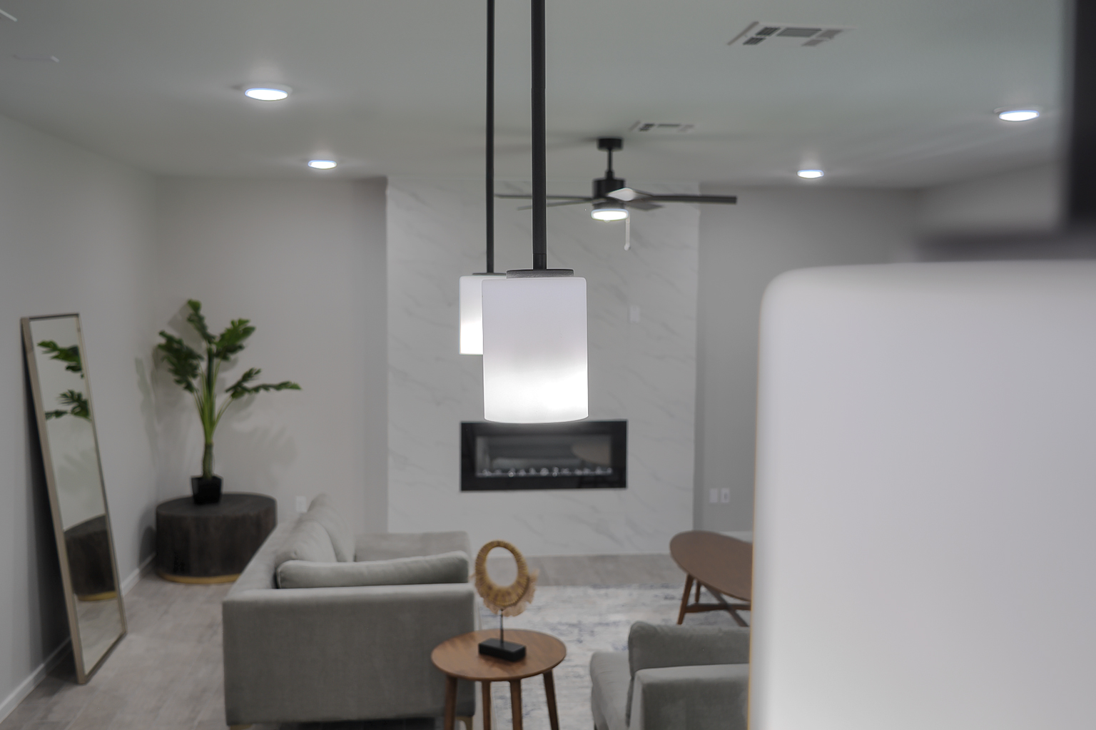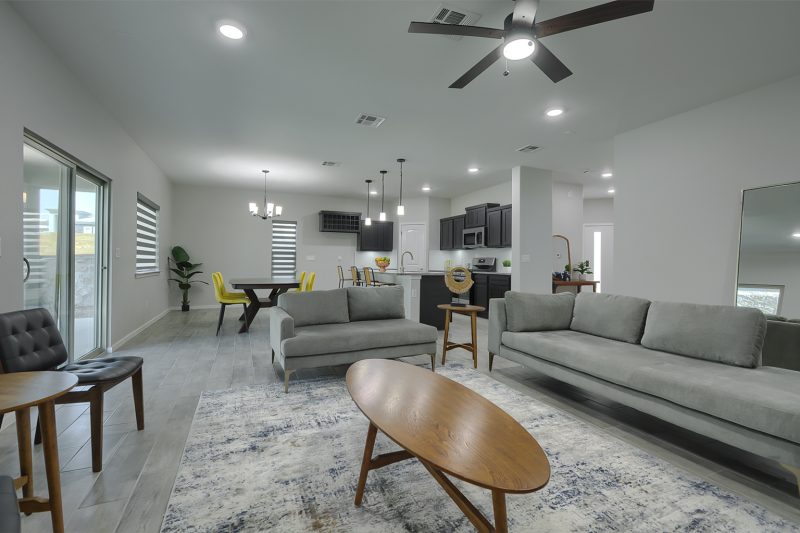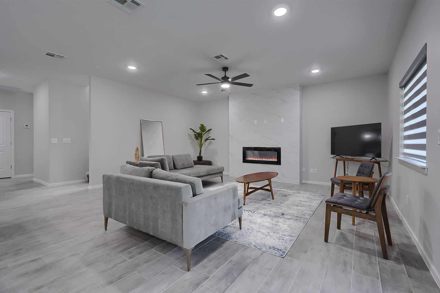 Introducing The James, a luxurious two-story home with a large laundry room and bathroom on the main floor, this spacious home offers the perfect blend of functionality and style. The open-concept living area, highlighted by an electric fireplace, seamlessly connects the dining area and kitchen, which boasts beautiful granite or quartz countertops, stainless steel appliances, and a walk-in pantry. The tiled flooring throughout the entire downstairs, including the bathrooms, adds an elegant touch.